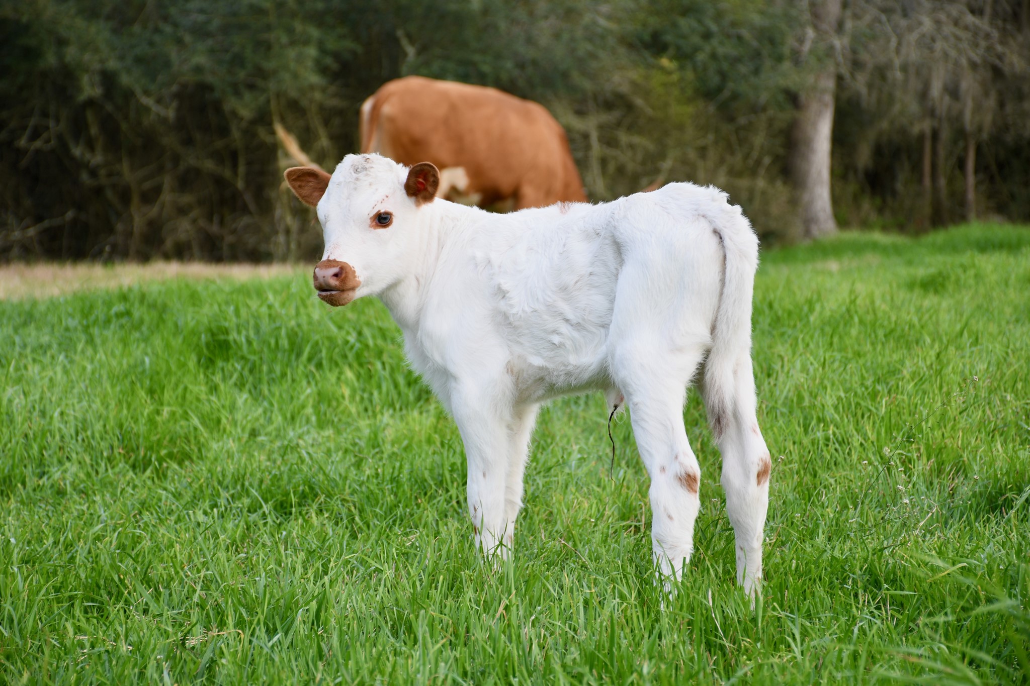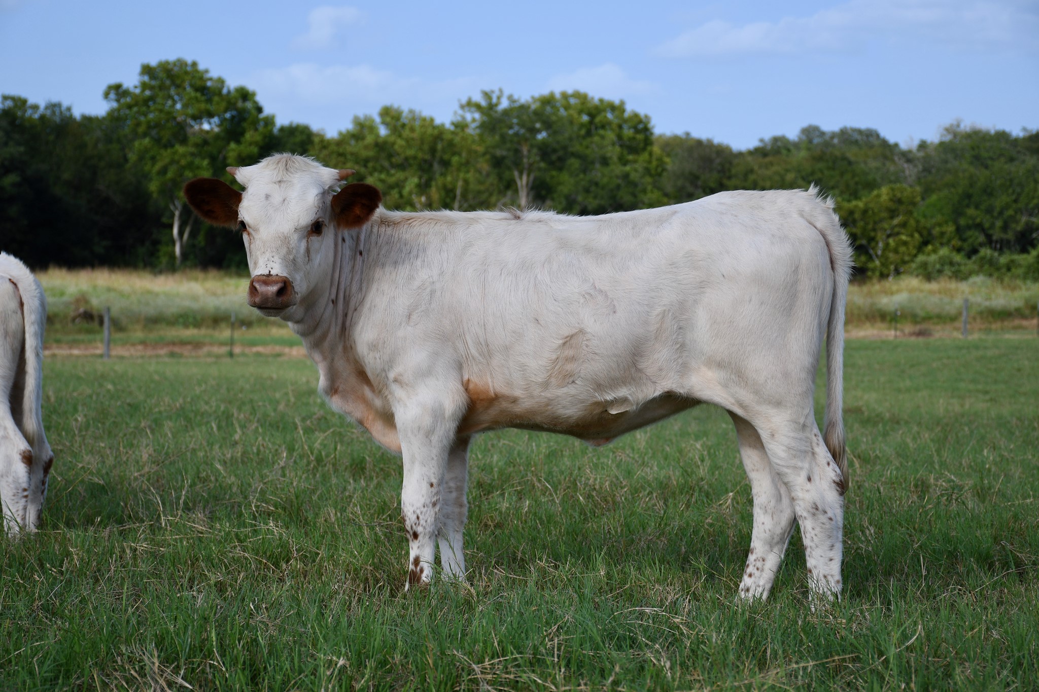White with brown spots. Stacking genetics with each generation. New heifer by Crackerjack.