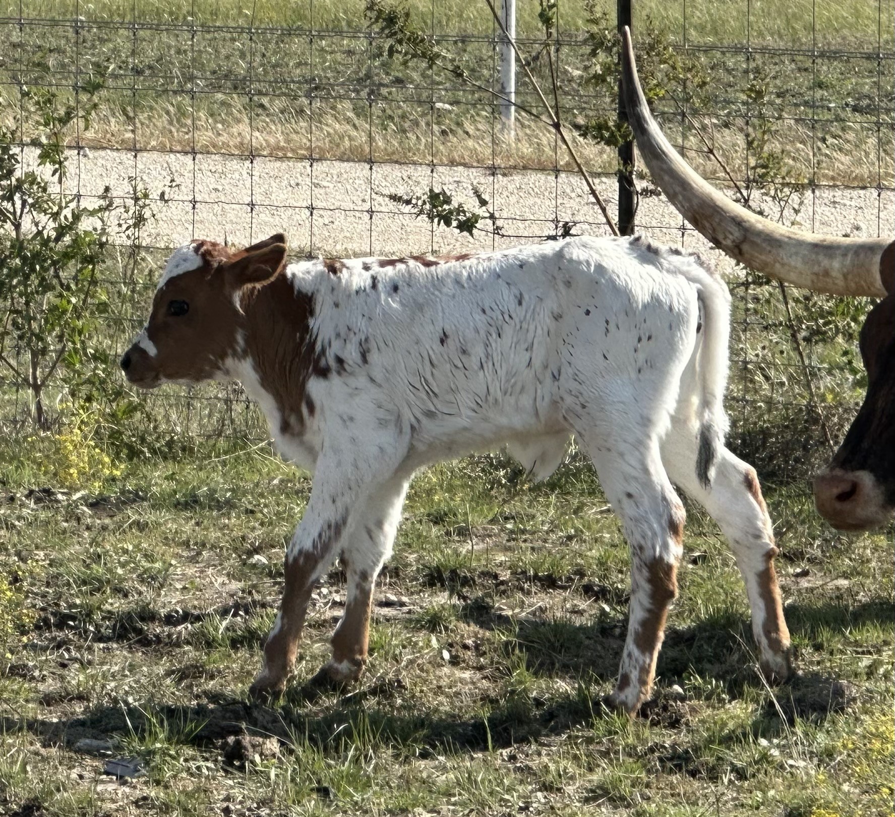 Parker brown spotted big bodied bull calf. He will be a great futurity prospect with his coloring and solid body. His sire is 20 Gauge with a pedigree that includes, ECR Unica, Concealed Weapon, Peacemaker and Cowboy Chex.